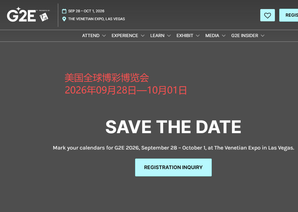 2026年美国全球博彩博览会展览名称:2026年美国全球博彩博览会(GlobalGamingExpo,简称G2E)英文名称:GlobalGamingExpo(G2E)展览时