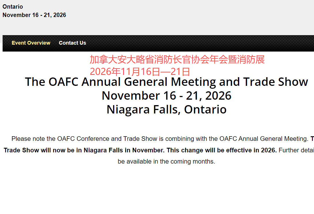 2026年加拿大安大略省消防长官协会年会暨消防展展览名称:2026年加拿大安大略省消防长官协会年会暨消防展英文名称:OAFCAnnualGeneralMeetingandTradeShow